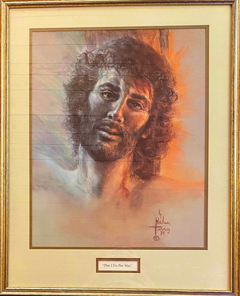 I read about an artist in 1998 who had gained some renown for her artistic depictions of biblical people during the time of Christ and of His disciples. What attracted my attention though was one of Christ on the cross called, “This I Do For You.” The artist’s name was Helen Terry. She came to my house and showed me pictures of many of her paintings and brought a large signed and numbered print of “This I Do For You” and gave it to me. What I found out upon her entering my home was she was on crutches. The metal kind that wrap around the forearm for extra stability. She had polio as a child. She entered my home looking as if she was laboring. My 90 lb. Doberman carefully walked by her side to give support to her and then sat beside her for the next couple of hours. He made sure her hand was on his head all the time she sat there, as if to say, “If you just keep petting me, you’ll feel better.” They made an immediate bond. She was also badly hurt in the only F3 tornado to hit Ft. Pierce, Fl. In all this, she did not complain. Looking at the print of her painting, it was easy to see she had been given a special insight by Him, which she then drew. Billy Graham has a print of her drawing, as does the Vatican. She died in 2013. Her print of “This I Do For You” is the first thing you see when you enter my home. It’s overpowering. The eyes of Jesus in this print convey the message, “You pick up your cross and follow Me.”